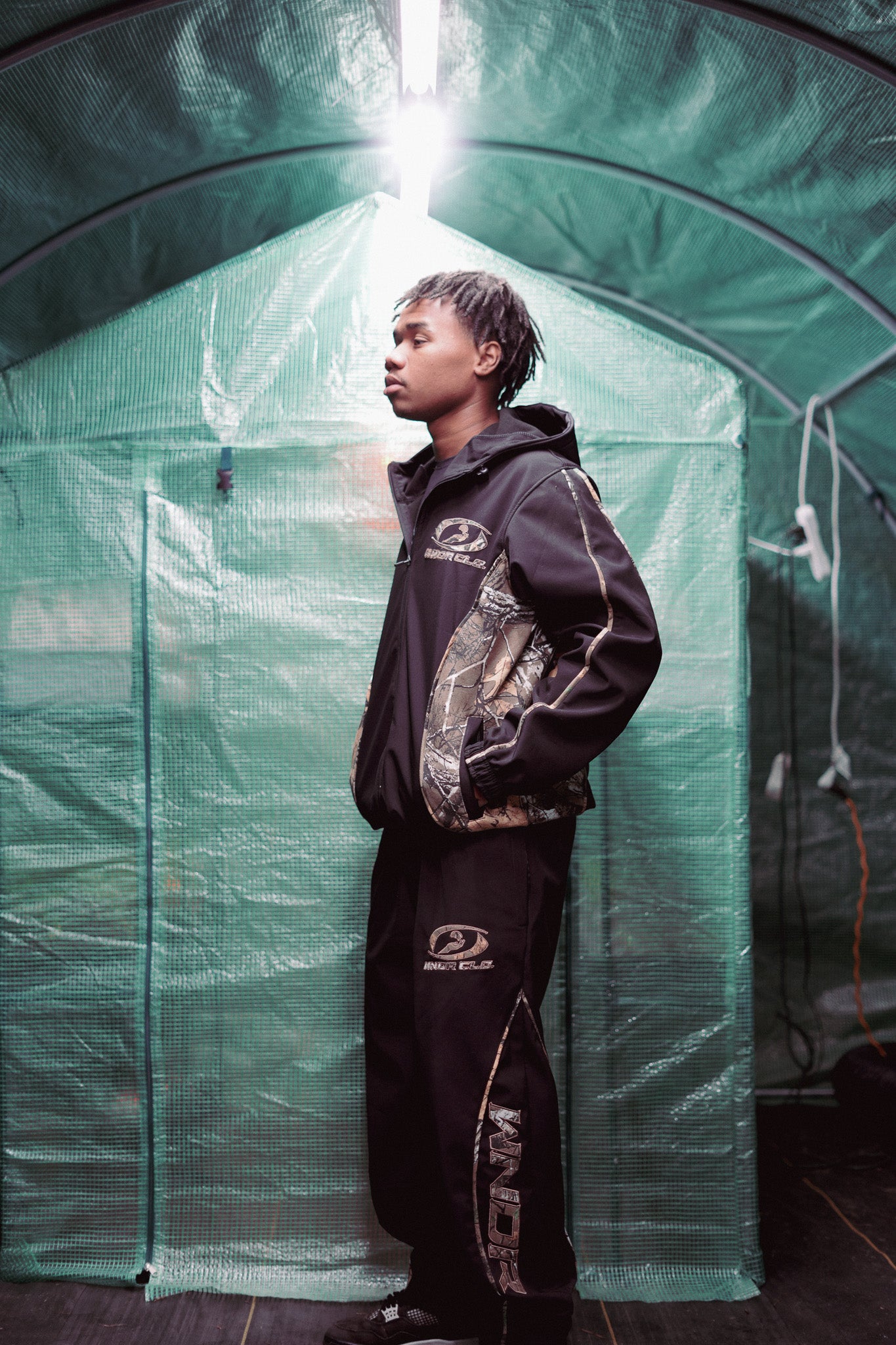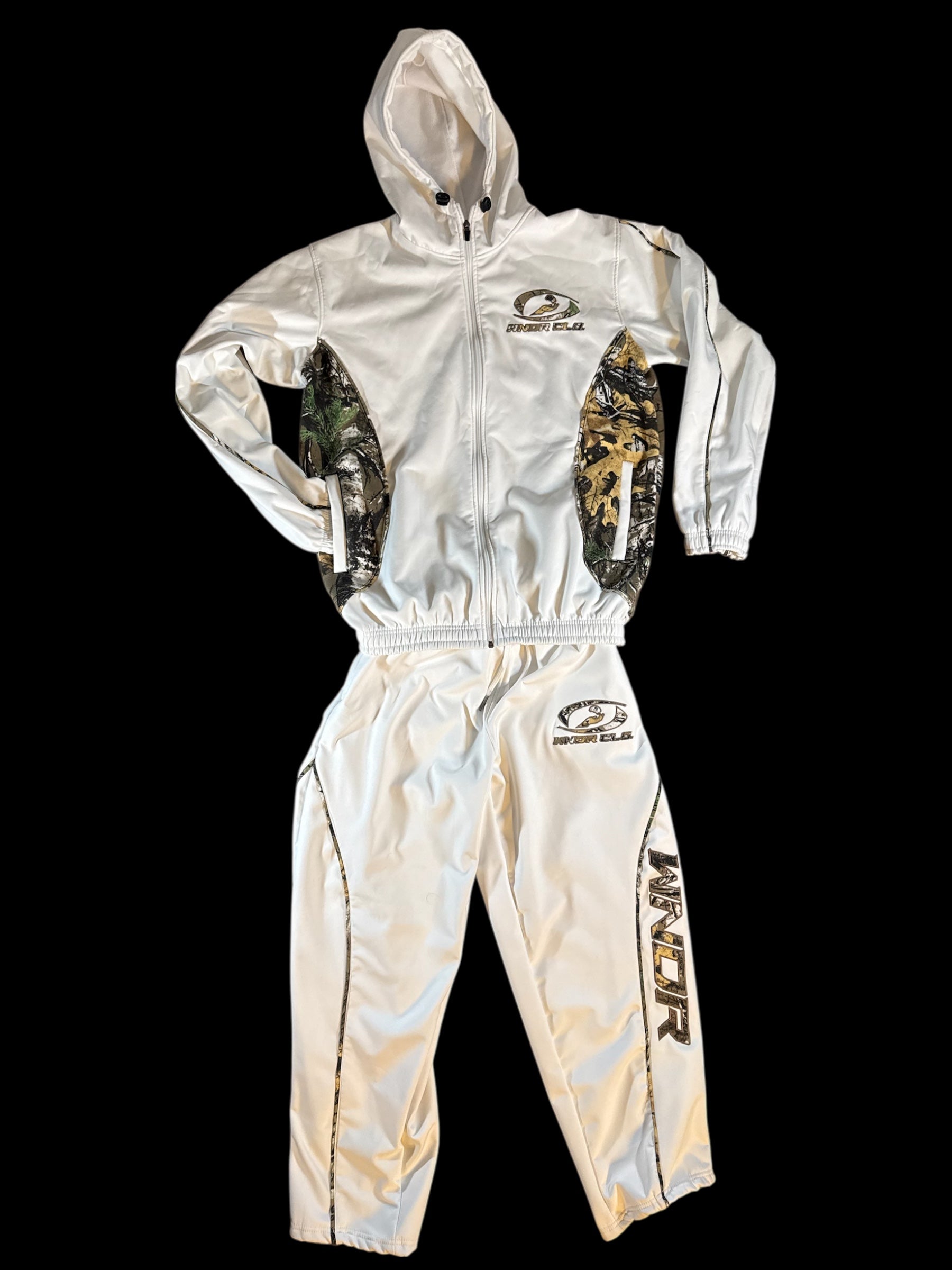 Two-piece technical set featuring a lightweight zip-up jacket and matching pants. Designed with camo side panel detailing, a oversized athletic fit, and elastic finishes for comfort and mobility. The jacket includes a full front zipper, adjustable hood, and elastic cuffs. The pants feature an elastic waistband and ankle cuffs. Finished with WNDR embroidered branding throughout. Available in Bone White and Midnight Black.